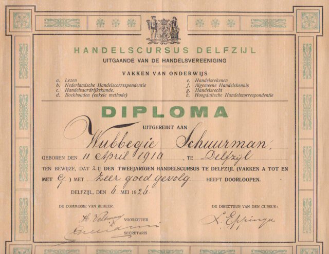 Ma: "Na de Mulo ging ik een paar jaar twee of drie avonden per week naar de Avondhandelsschool; ik leerde daar van alles zoals boekhouden en handelsrekenen, alleen de talen vielen me niet mee. Ik heb er nog een diploma van." |