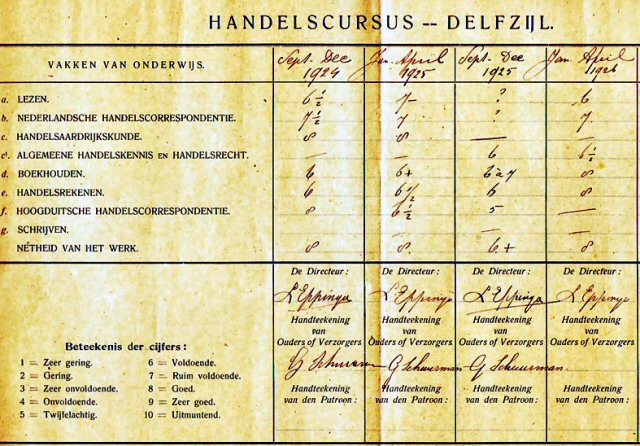 De cijferlijst was te groot voor mijn scanner, maar de niet overgenomen vijfde kolom bevat weinig extra informatie. De lijsten zijn ondertekend door grootvader Gerhardus. We zien dat de cursus alleen in het najaar van september tot december en in het voorjaar, van januari tot april, liep en zich over een periode van twee jaar uitstrekte. Ma haalde achten voor handelsaardrijkskunde, voor boekhouden, handelsrekenen en voor netheid. |