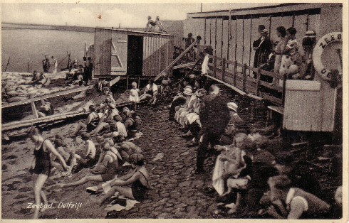 Dit was op de Zeedijk. Daar heb vanaf dat ik jong was tot mijn achttiende gebaad. Kijk, je ziet de kleedhokjes. Het bad was maar zes uur per dag open, met het opkomende en afgaande tij van het hoogwater. Streng gescheiden, geen meisjes met jongens, geen mannen met vrouwen. Eerst de meisjes, het eerste kwart van de vloed, dan de vrouwen van kwart tot vol, dan de mannen tot half naar beneden en tenslotte de jongens. De mannen op de foto mochten daar wel zitten maar niet samen met de vrouwen het water in, ook echtparen niet. |