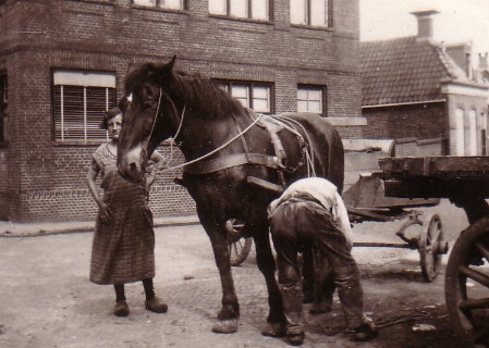 We hadden vier tot zes paarden, afhankelijk van de hoeveelheid werk die er was. Vader was een goede koopman wat paarden betreft. Hij moest soms voor zijn werk paarden kopen maar vond het ook wel leuk om naar de markt te gaan. Dat vond hij iets moois; de grote Zuidlaarder markt, de markt in Slochteren en de veemarkt in Delfzijl. Die was op de tweede of derde donderdag in oktober en trok volk van overal. Koeien, schapen, alle soorten vee werden verhandeld. De markt werd midden in de kom van het dorp gehouden en tegelijk was er ook kermis. Om zes of zeven uur in de ochtend was daar al heel wat handel. In de middag werd ik wel door moeder naar de markt gestuurd om vader op te gaan halen. Hij wilde dan niet altijd met me meekomen. Hij kon drank eigenlijk niet goed verdragen en een keer gaf hij me boos een trap. Ik was doodsbenauwd. In de winter stond het vee thuis op stal. Er waren twee grote schuren: een lange voor de koeien en een kortere voor de paarden. Op de zolder van de schuren lag het hooi. Direct buiten de paardestal lag de mesthoop. Dat was voor ons een vanzelfsprekende zaak waar we verder nooit bij stilstonden. Buiten waren ook de putten voor het drinkwater. De koeien moesten twee maal daags anderhalve emmer water. Dat was zwaar werk. We hielden wel kippen maar geen varkens en alleen voor ons zelf. We hadden een tuin verderop, niet zo ver. Daar kwam van alles uit: aardappels, snijbonen, andijvie maar geen fruit. We kochten wel appels. We waren ook vreselijk zuinig, anders waren we ook niet omhooggekomen. Er heerste in die tijd eigenlijk vreselijke armoede. Er waren ook nog niet zoveel soorten levensmiddelen die je kocht. Suiker, zout, brood, koffie en thee, rijst waar je pap van maakte die je met suiker at. We waren thuis met de drank vrij sober. Met Nieuwjaar werden er wel een paar borreltjes gedronken. Dat waren dan brandewijntjes met citroen of zwarte bessen. Echte jenever vonden wij zuipen. Er waren verschillende buurten, vooral in de Molenberg, waar veel gedronken werd, vooral onder arbeiders en bootwerkers. Dat ging vaak ten koste van hun gezin. |