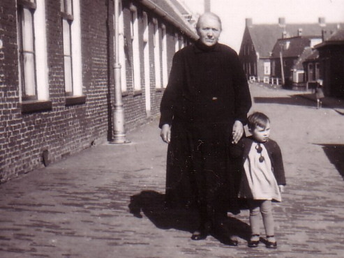 Gretha: "Zowel Opa als Oma waren voor mij heel prettige mensen die erg blij waren als Mams met mij en Jenny zo eens in de zes weken of twee maanden een paar dagen met de trein kwamen. Mams gebruikte die tijd in Delfzijl om haar vriendinnen en bekenden op te zoeken. Opoe mopperde daar wel eens over. Ze was heel blij met de kleinkinderen, maar het was haar wel eens te veel als ze ook de klanten moest helpen die aan de deur kwamen. Ze had een liter en een halve liter maat, waarmee ze de melk, zo van de koe uit de melkbus schepte. Opa zat meestal in een stoel met een hoge rug naast de kachel, altijd met de pet op. Hij nam mij vaak op zijn knie en zong dan "Hupsa Janneke, stroop in het kanneke, laat de poppetjes dansen." In de woonkamer waren twee bedsteden met deuren ervoor, dat het net kasten leken. In de ene sliep Opoe. De aardappels werden eronder bewaard, zodat ze niet konden bevriezen. De andere bedstee werd als kast gebruikt. Opoe had altijd eierkoeken, die zacht waren en Jenny ook kon eten. Boven op de zolder hingen in het najaar de aangeregen bonen te drogen. Vanaf de zolder kwam je met een deur in een lange smalle slaapkamer, met een bedstee aan de ene kant en twee er tegenover. Opa sliep in de bedstee aan de ene kant. Mams met ons in de andere twee. Er zaten daar ook deuren voor. Ik vond het prachtig om in zo'n klein huisje te slapen." |