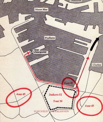 Vanuit Rotterdam kon men de vuurgloed boven de Waalhaven zien. De regionale brandweer kon niet in de buurt komen, net zomin als de per taxi aangesnelde journalist en persfotograaf, tuk op nieuws en indrukwekkende foto's. Van de circa 1000 verdedigers waren er 51 gesneuveld of dodelijk verwond en 400 krijgsgevangen gemaakt. Een deel van de Duitsers trok in de richting van de Maasbruggen, de dikke zwarte pijl op het bovenstaand kaartje.. De aanvoer van materieel en manschappen via het vliegveld Waalhaven speelde een grote rol bij de slag om de Willemsbrug bij het Noordereiland in Rotterdam. | |