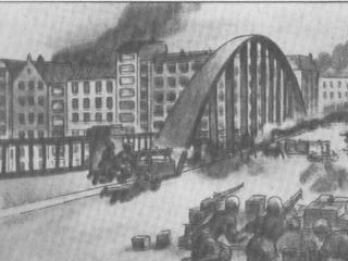 In Rotterdam waren 7000 militairen gelegerd, maar slechts 1000 waren voor het gevecht opgeleid; ze waren zwak bewapend met mitrailleurs. Het grootste deel werd defensief ingezet op grond van de geruchten over de vijfde colonne. Een paar marinevaartuigen werden op de Maasbruggen afgestuurd maar ze konden, belaagd door duikbommenwerpers, tegen de zware Duitse mitrailleurs weinig uitrichten. Er werd vooral bij de Willemsbrug gevochten. We heroverden het Maashotel, maar het werd daarna van het Noordereiland door mortiervuur in brand geschoten. De brand breidde zich langs de Boompjes van pand tot pand uit. De Duitsers stonden in Rotterdam-Zuid, op het Noordereiland en op de Willemsbrug naar Rotterdam-Noord. Maar aan de noordkant van de bruggen wisten ze slechts met moeite een stukje van de stad te houden in de volgende vier dagen. Behalve wat betreft de luchtmacht waren de Duitsers ook zeer bij de tijd met propaganda. Ze beweerden dat ze Nederland kwamen redden van een Engels en Frans bezettingsleger. Volgens een groot opgemaakt zogenaamd interview met de kapitein van het Nederlandse stoomschip "Zaanland" te Rio de Janeiro waren er al 10.000 Engelse soldaten in Nederland. Uit een Duitse propagandastrip dit plaatje met het onderschrift: "De verovering van de Maasbruggen". | |