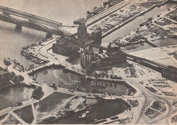 Een filmpje van Andor von Barsy uit 1930, op Youtube, laat Rotterdam zien zoals het er toen uitzag. Een tram op de Maasbrug, karren door paarden getrokken, een kerktoren, een molen. Allerlei boten varen door de stad. Goederen worden op de kade gezet, mannen in hemdsmouwen laden bananen uit, kranen halen hout uit de schepen. In 1940 valt daar in één keer een groot gat in, van de Westersingel naar de Oostersingel, naar de Goudsesingel, naar het zuiden tot aan de rivier, een enorme vlakte met een paar resten waarvan later nog het meeste wordt gesloopt, vaak tegen de zin van de bewoners in. | |